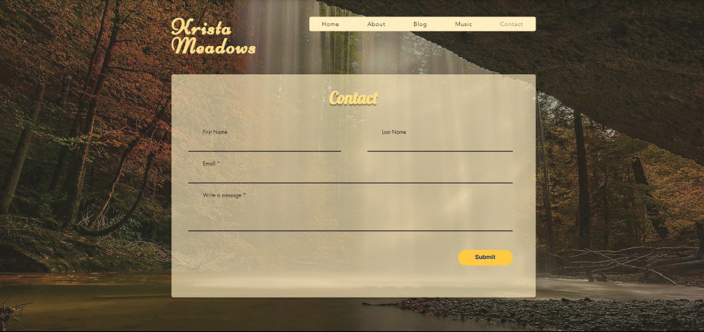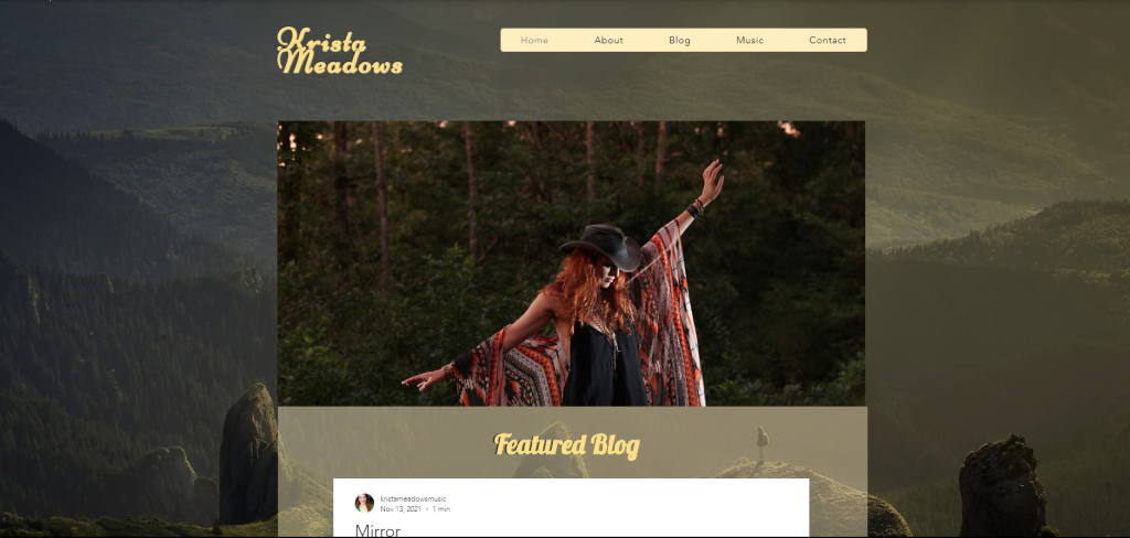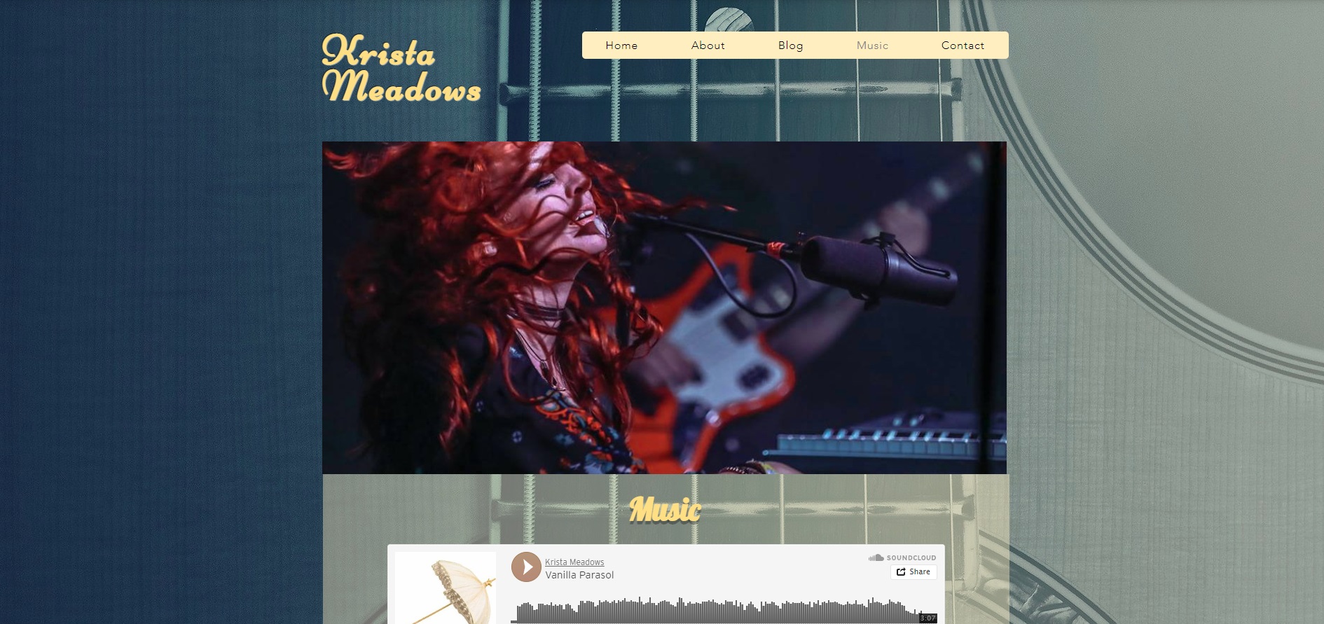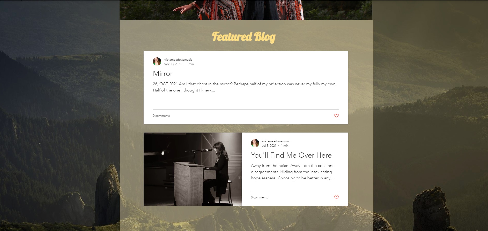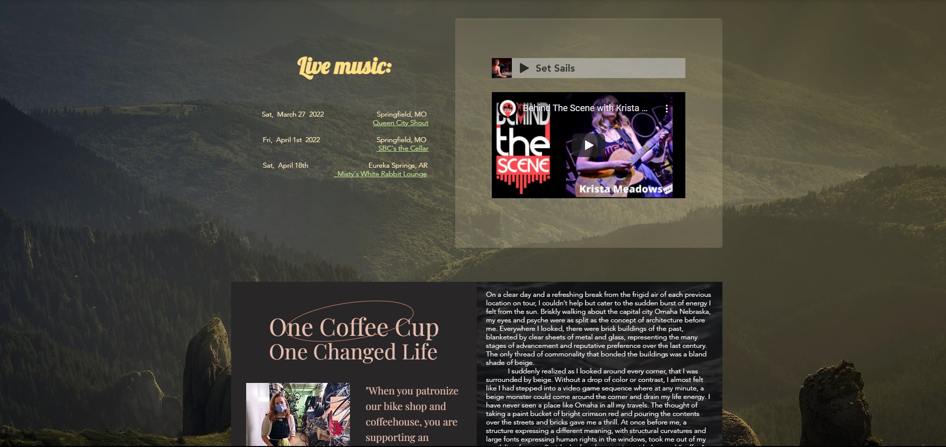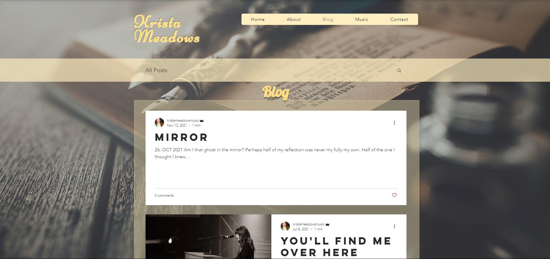 A web redesign for an independent musician who wanted to rebrand as a blogger and writer while still maintaining some focus on their music offerings. The goal was to redesign the website to feature the author's blog with their music standing more secondary. Previously, the website had been designed to feature music with the focus on the client's music, media kit, tour dates, and other ways for their audience to interact and keep up with their performances. The client wanted to rebrand to shift the focus to their writing and have a blog with a template that auto-populates blog entries in Wix.