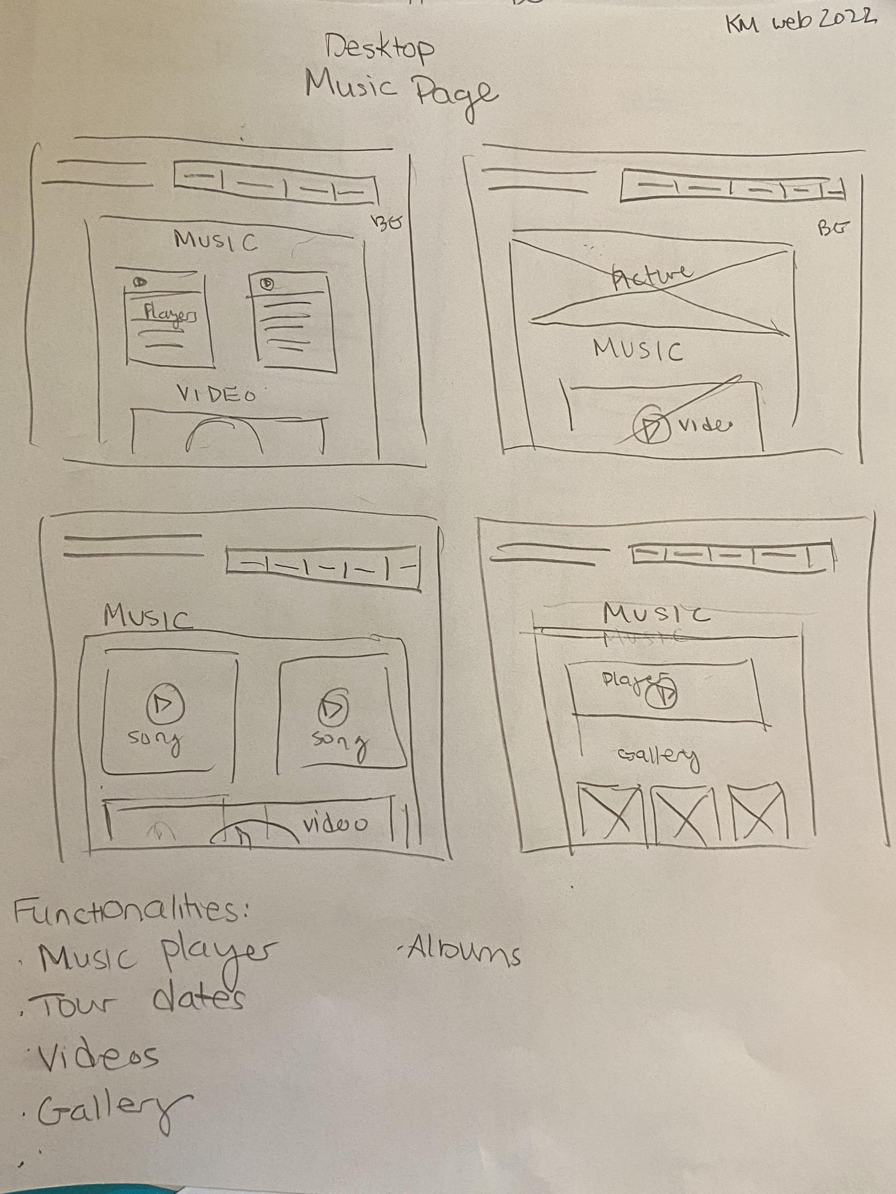I created sketches for the home page and basic navigation. I focused on the blog as a priority on the home page, but also wanted to include music videos and players as a secondary focus as the client had on their original home page. After the client approved basic layout, I created sketches for the blog and music pages. I experimented with different ways of displaying the auto-populating blogs, music player, tour dates, video, and gallery on their respective pages.