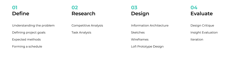 I broke down the scope of the project into the phases of the design process, starting with planning the project and defining goals. Then followed by research and analysis, designing information architecture, sketches, wireframes, a prototype. Finally, it would conclude with a design critique and iteration of final details. The project was to take place over the course of a month so a week would be dedicated to each phase.