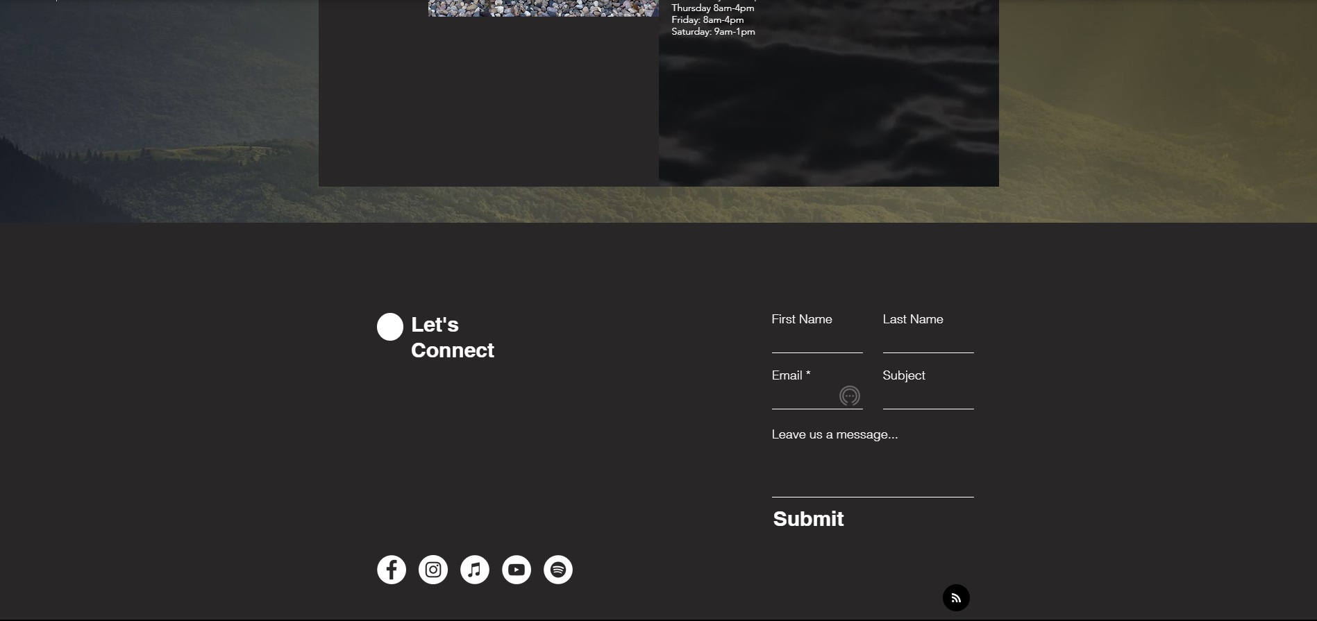 Finished product images of the blog, music, and contact pages. The blog page has auto populating posts through Wix that also allows you to search and filter articles. The music page underwent updated design to the new template and maintained the features it had previously. The contact page invites viewers to contact the client for collaboration and potential projects. I also achieved AA accessibility on all copy across the responsive design.