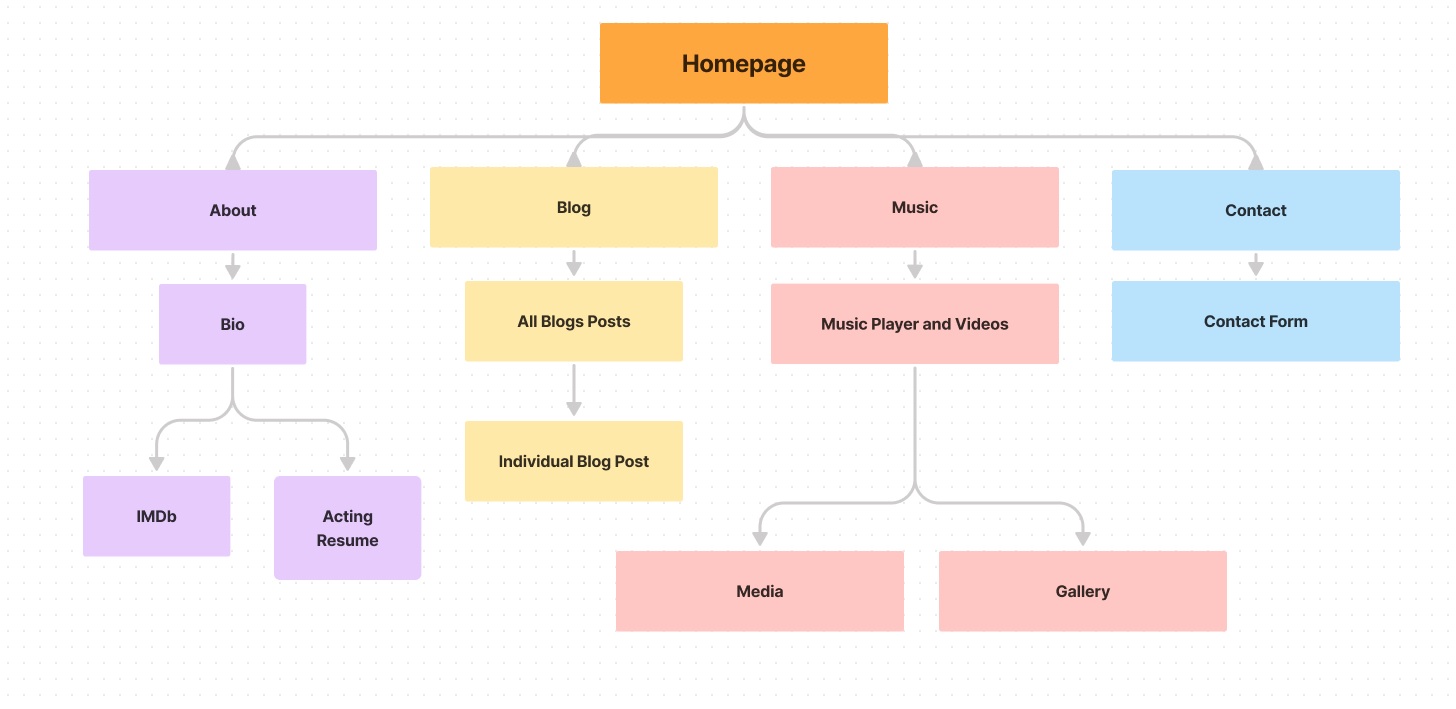 I created an information architecture diagram in FigJam and assigned clear organization to the different areas of the portfolio. It was a priority to achieve clear navigation for user who are looking through the client's skillset. I wanted to put the individual as the highest focus, followed by the writing portfolio, with music following, and contact as a call-to-action to put viewers in connection with the client.