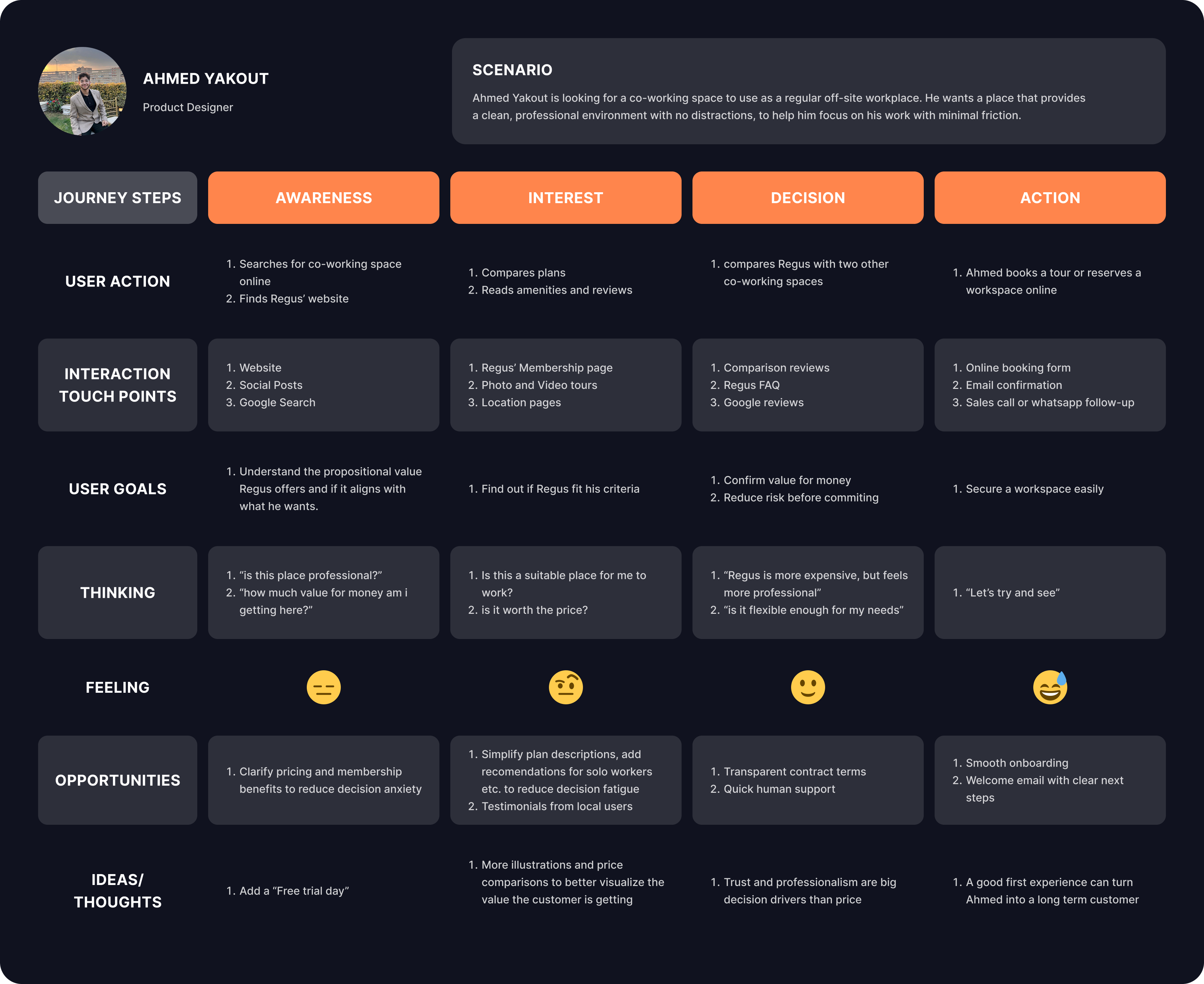 Regus is also a good case study because it reflects the real decision-making tension faced by Egyptian users: choosing between local co-working spaces and an internationally trusted brand that operates locally. Its Egyptian locations allow the journey map to stay grounded in a local context while still reflecting global service standards. This makes the customer journey more authentic, as it captures how trust, proximity, pricing, and professionalism can influence decision making.
