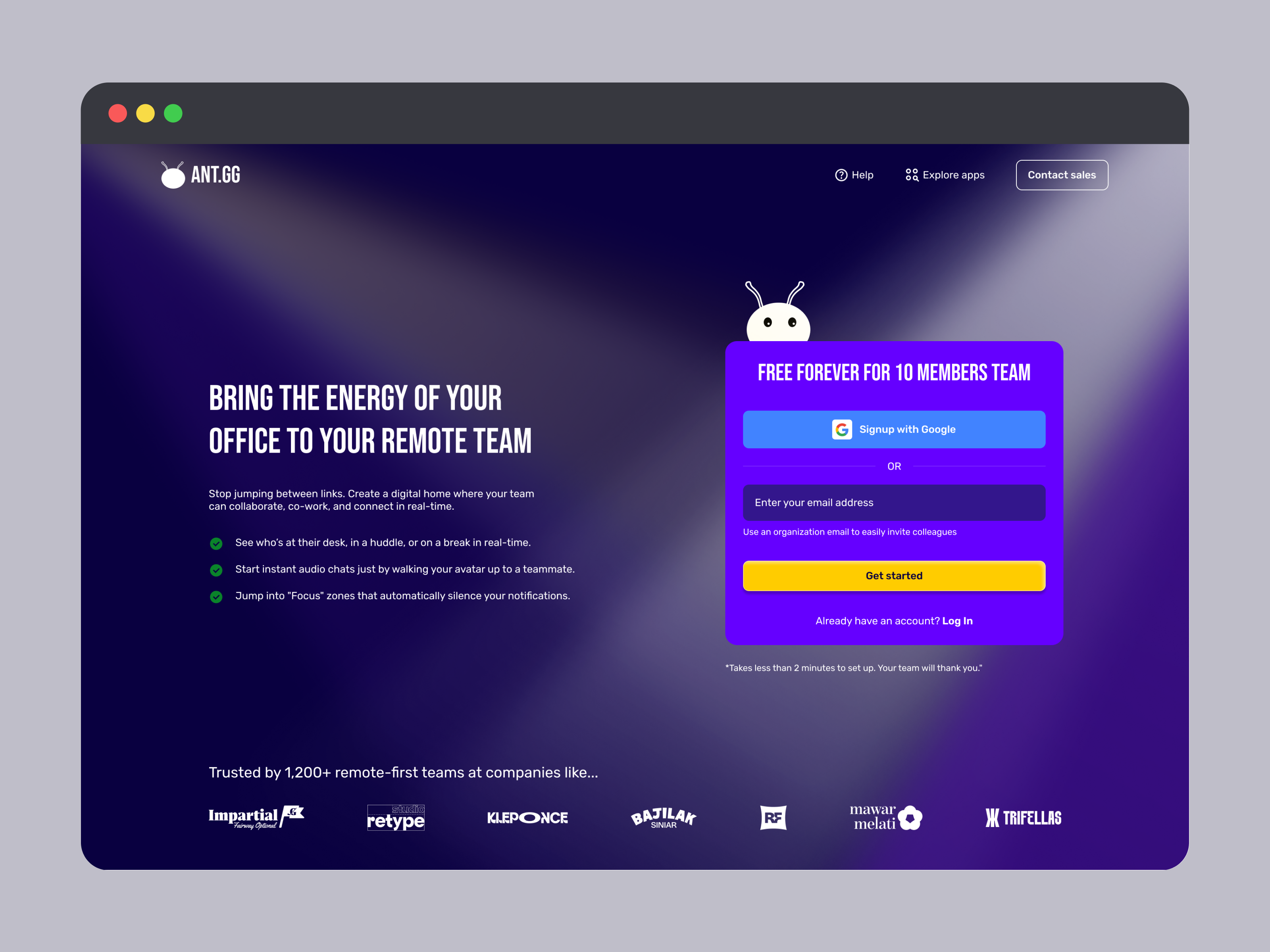 This is an exciting task, designing a SaaS sign-up page, and this time I chose my own app, ANT.gg, which offers a digital workspace/office for a remote team. This app is just my personal project tho, not published yet, but I built it seriously just in case :)