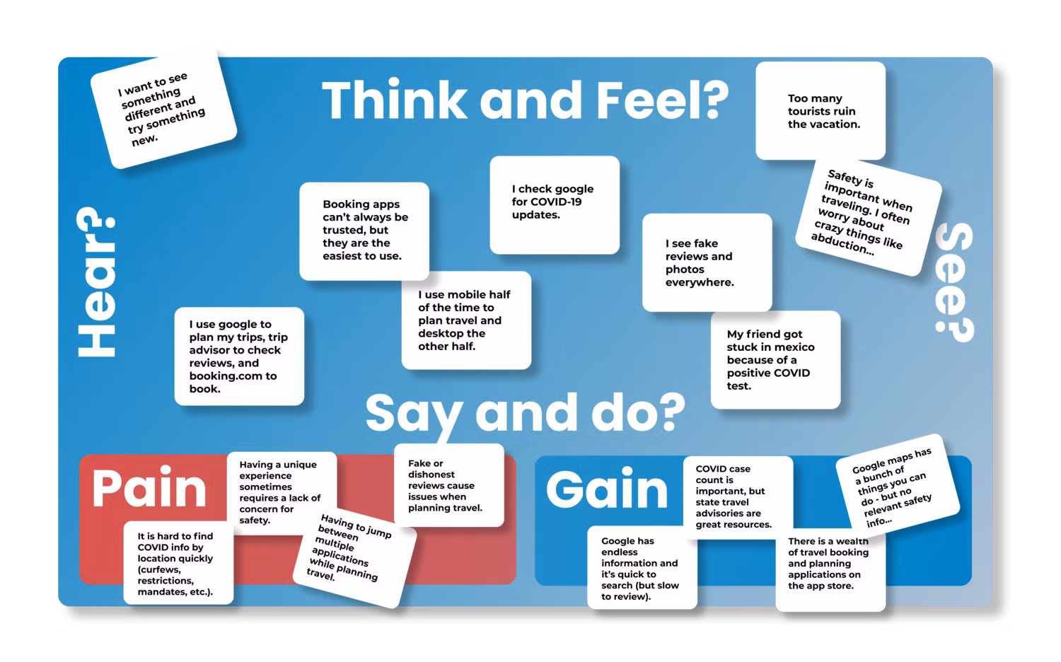 Utilizing an empathy map allowed deepened understanding of user concerns. Due to the wide range of feedback received from surveys and interviews, I believed it would help organize multiple pain points into a few focused user frustrations.