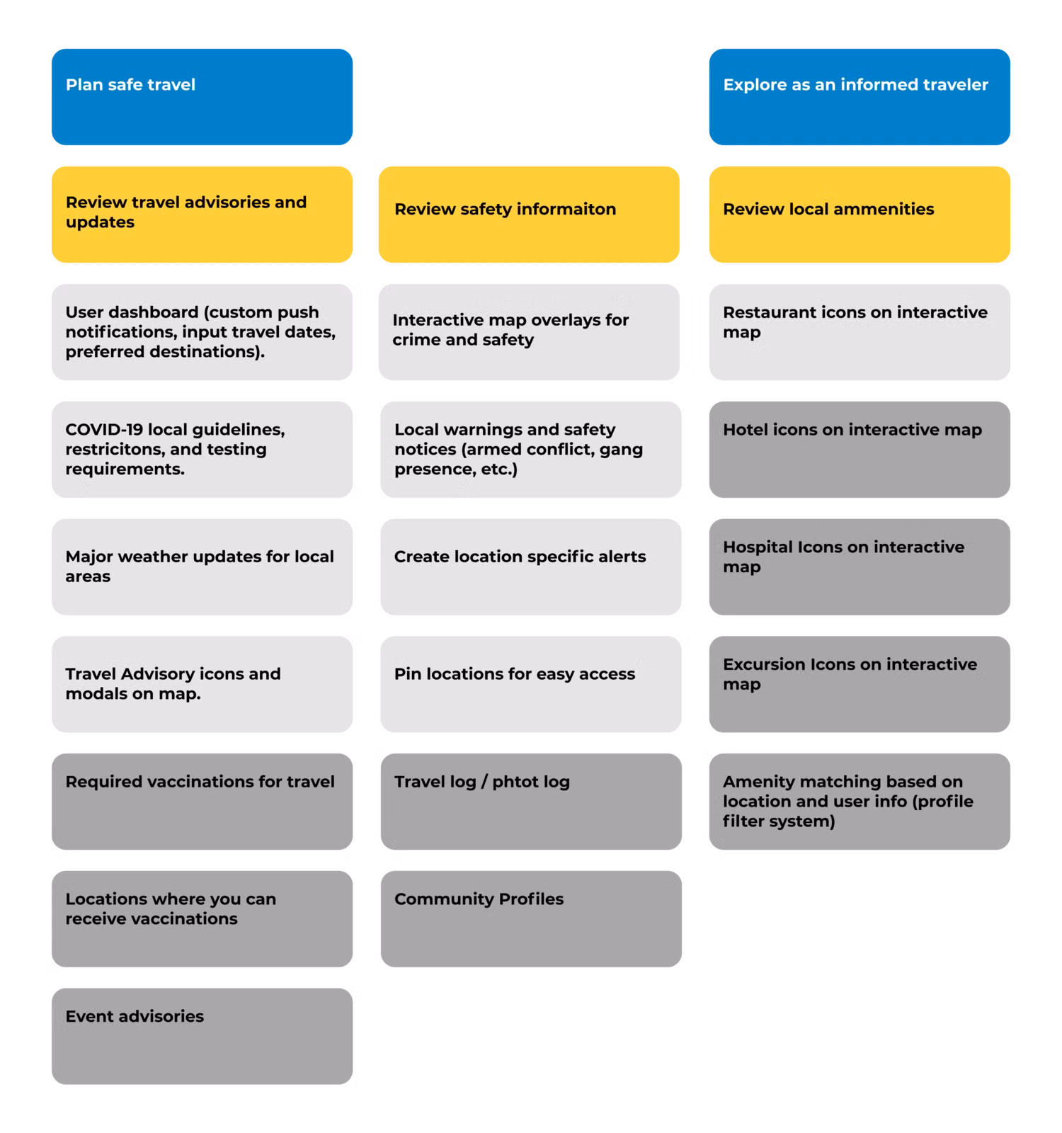 So, we pivoted the product from a simple itinerary planner to a health and safety application aimed at creating an informed traveler by providing real-time data on COVID-19 restrictions, outbreaks, and regulations in a central location. Users would also have access to local amenities and excursions with reviews so they could plan their travel confidently in the same location they receive their updates on global conditions.