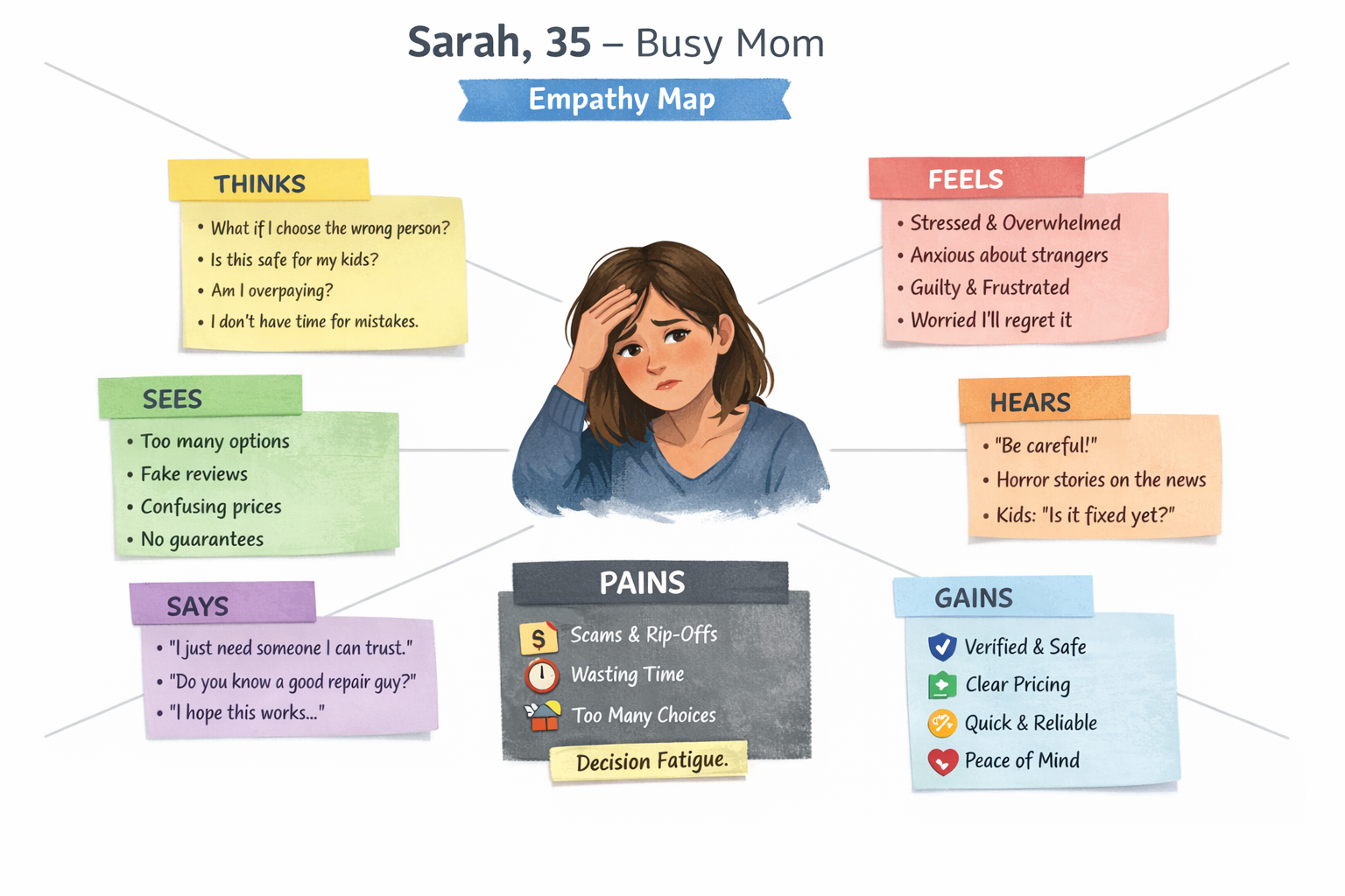 Sarah is a 35 year old woman living with her children, she goes to work every day .Her heater broke down and she does not have time to call a technician to fix it . The children are complaining of getting late for school everyday , so she needs someone who is quickly available and trustworthy .She needs someone who has background experience in fixing heaters and someone has got a transparent pricing upfront. This is her empathy map.