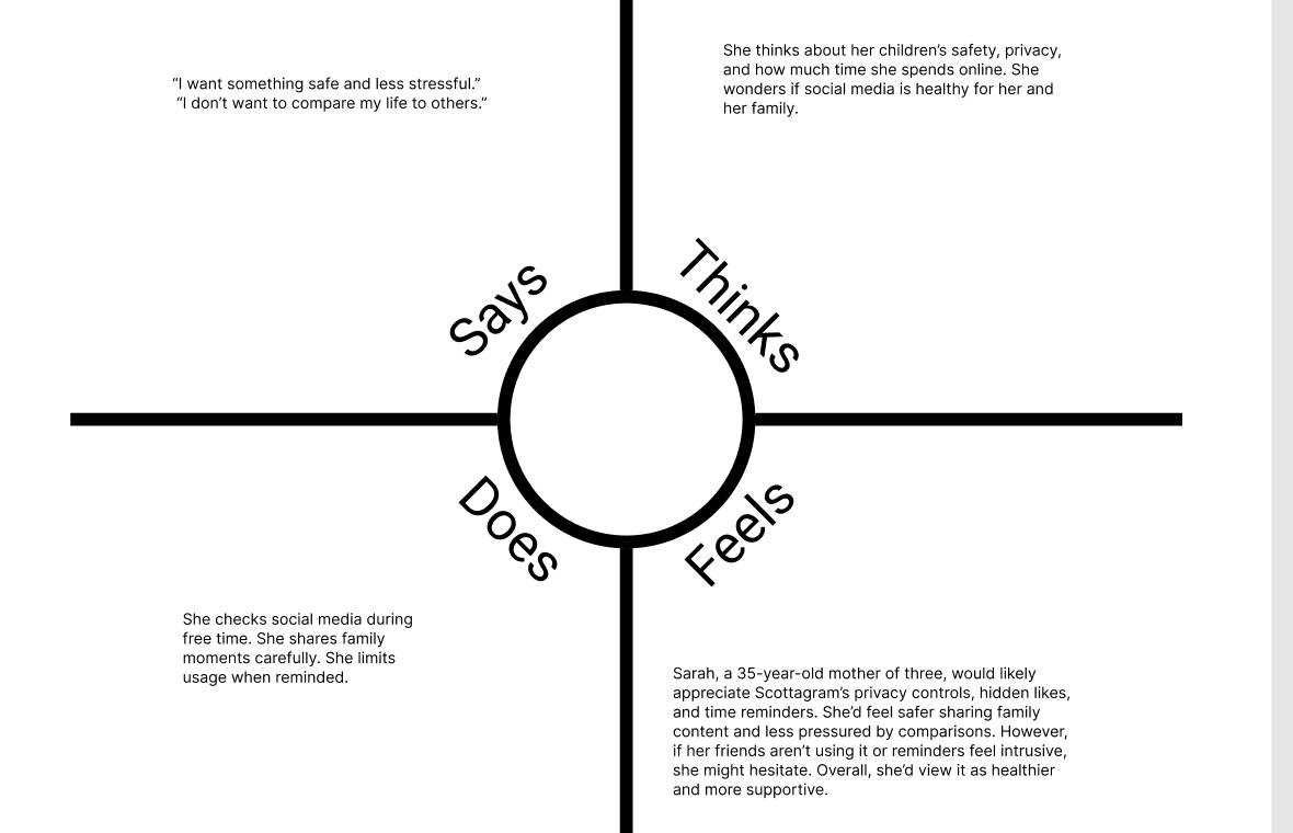 Sarah, a 35-year-old mother of three, would likely appreciate Scottagram’s privacy controls, hidden likes, and time reminders. She’d feel safer sharing family content and less pressured by comparisons. However, if her friends aren’t using it or reminders feel intrusive, she might hesitate. Overall, she’d view it as healthier and more supportive.