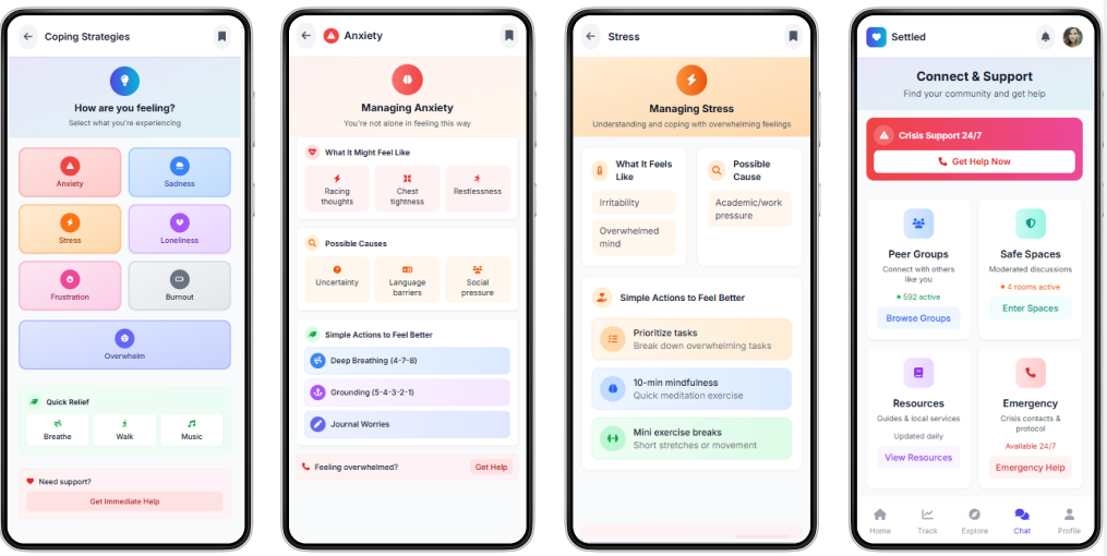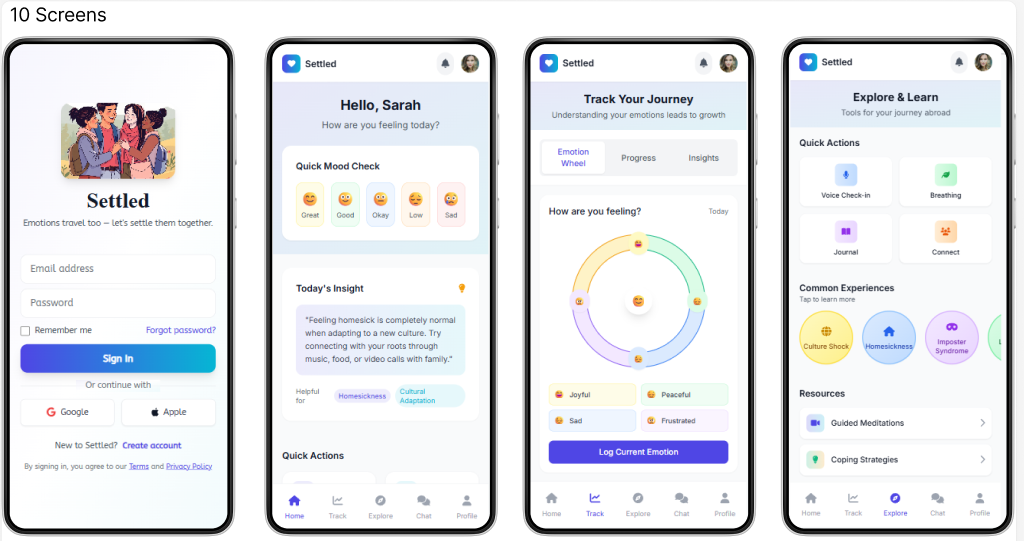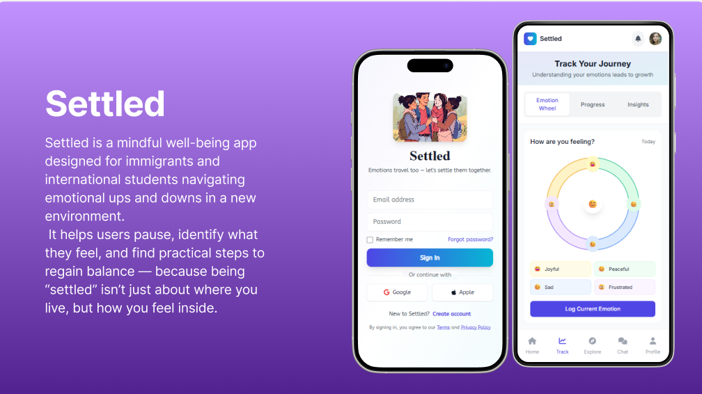 Settled is a mobile app designed to support the mental and emotional well-being of immigrants and international students adapting to a new environment. It helps users identify their moods, manage emotions, and build a sense of belonging while living abroad.