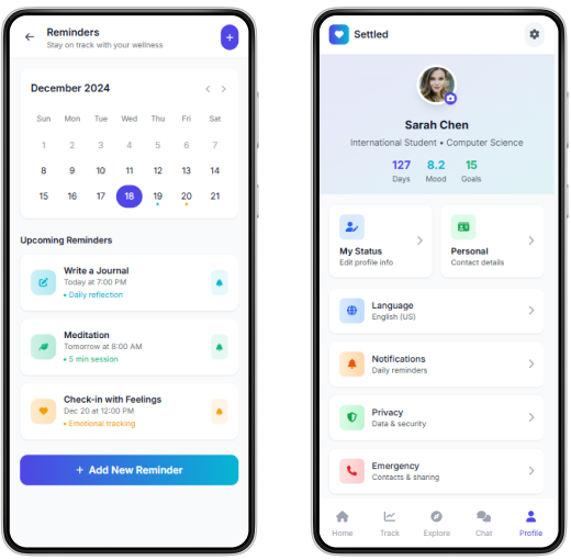 Settled is a mindful well-being app designed for immigrants and international students navigating emotional ups and downs in a new environment.