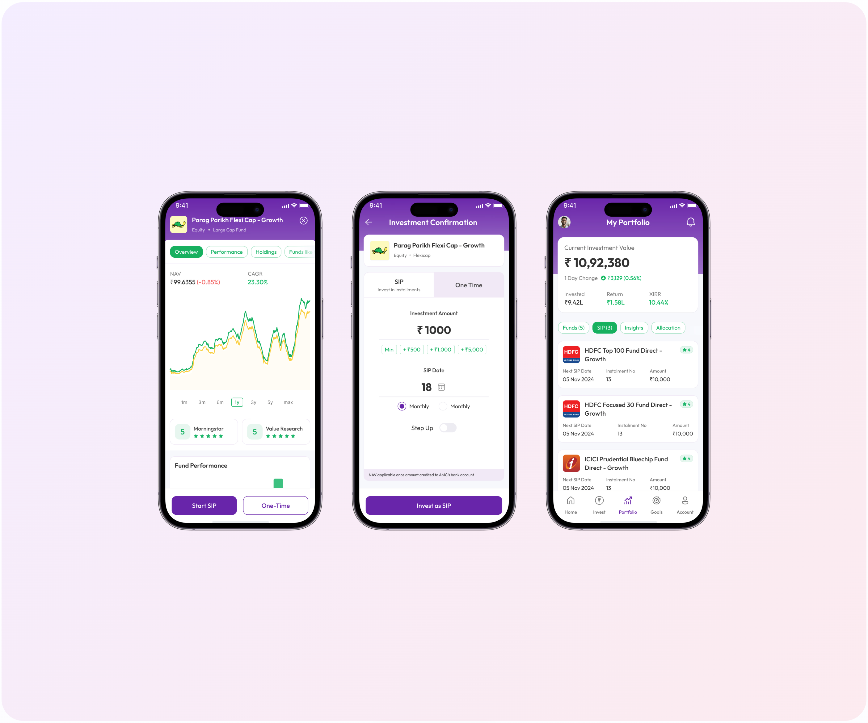 Investing in mutual funds can be a complex and intimidating process for new users. Many existing apps suffer from overcrowded interfaces and a lack of guidance, which can overwhelm users, particularly those without prior investment experience. Our challenge was to design a mutual fund app that simplifies the investment journey, promotes transparency, and enhances user confidence through a clean, user-friendly interface.