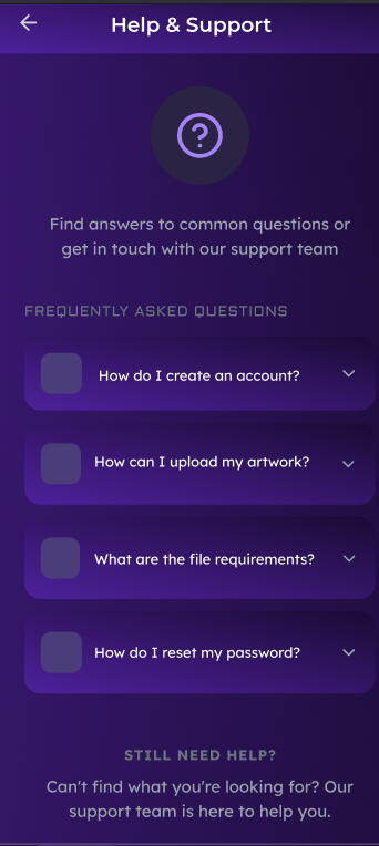 • FAQ section with expandable cards (e.g., account creation, uploading artwork, file requirements, password reset)