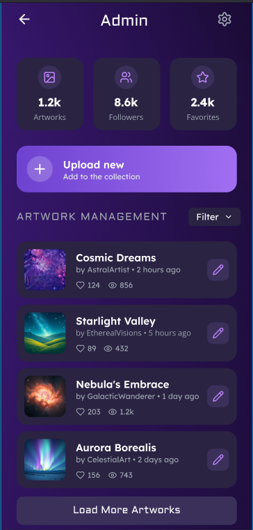 “Style artwork cards with glowing frames, edit/delete icons as celestial glyphs, and 'Upload New' as radiant starburst button.”