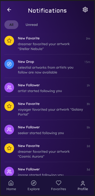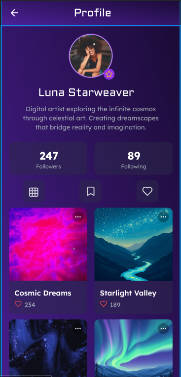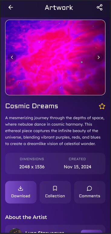 These screens establish the brand’s tone and usability from the start. As an art-related app, the social logins include popular visual-related apps such as Dribbble, Pinterest, and Behance. Celestial styling and consistent layout create a seamless entry experience.