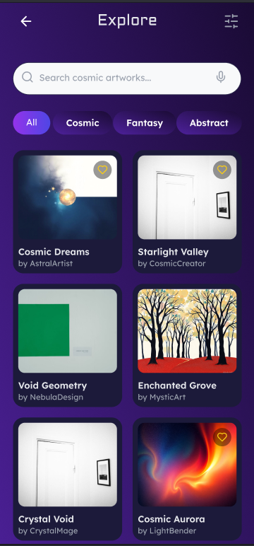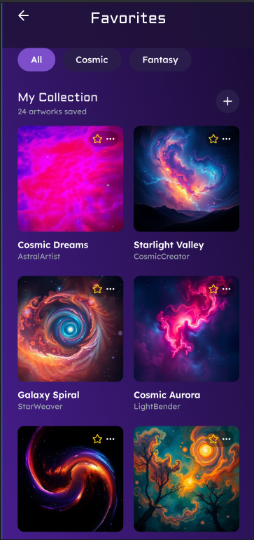 "Add glowing frame around artwork, elegant serif title, swipe indicators, and star icon for favorite items. Background inspo: soft cosmic halo.”