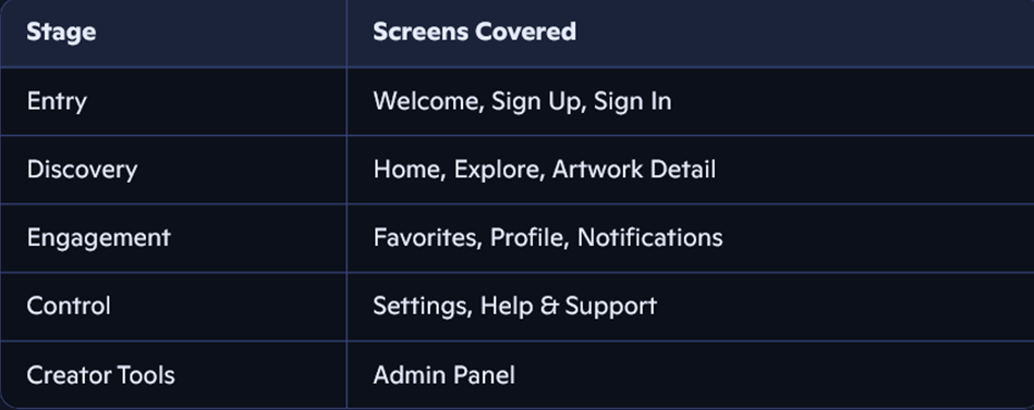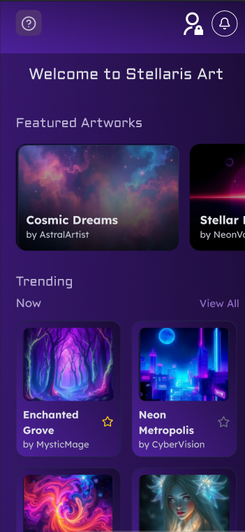 STELLARIS is a celestial-themed digital art gallery MVP designed to immerse users in a mythic, neo-fantasy experience. The app blends storytelling, visual exploration, and intuitive interaction to help users discover and curate digital artworks. This case study documents the design of 12 essential screens using AI-assisted workflows, with a focus on prompt iteration, brand cohesion, and usability.