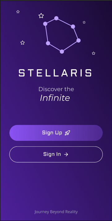 “Refine the welcome screen with a gradient night-sky background, glowing constellation logo, and tagline 'Discover the Infinite.' Buttons should have radiant edges.”