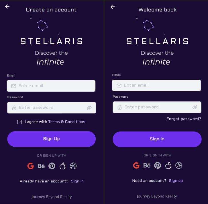 “Style both screens with a celestial theme. Use a dark purple gradient background, glowing input borders, constellation-inspired icons for social logins, and elegant typography. Include brand elements like 'STELLARIS' and the tagline 'Discover the Infinite.'”