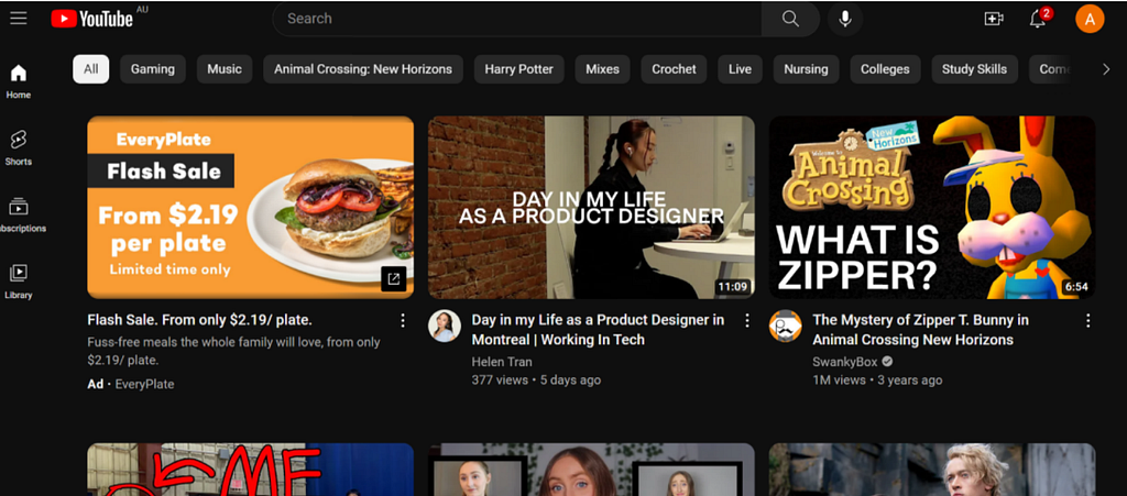 The inspiration for this approach was taken by the explore page of YouTube which has “topics” selected based upon users recent search history.
