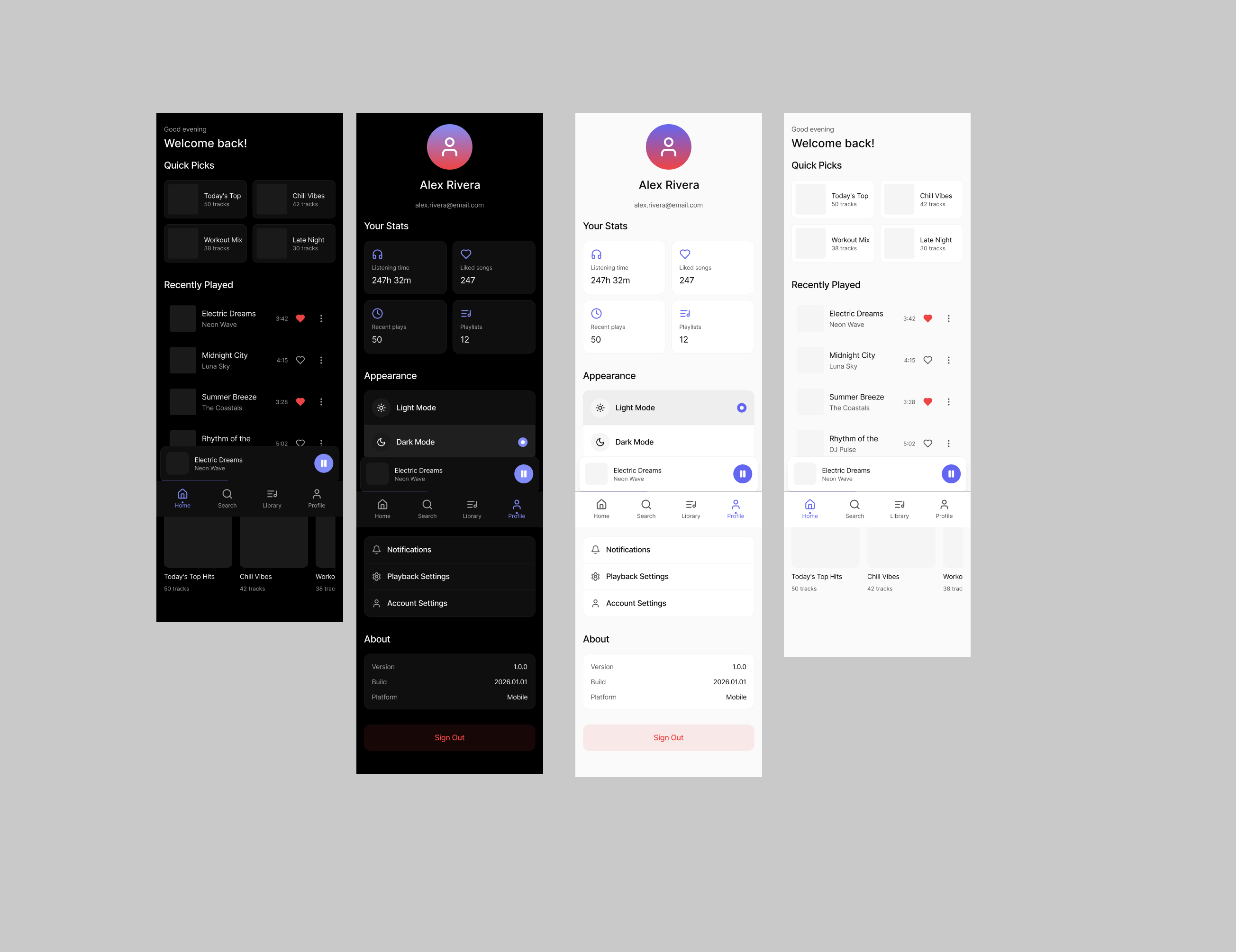 - Profile Screen - User settings, watch history with progress bars, appearance controls including the theme toggle, and WCAG compliance information
