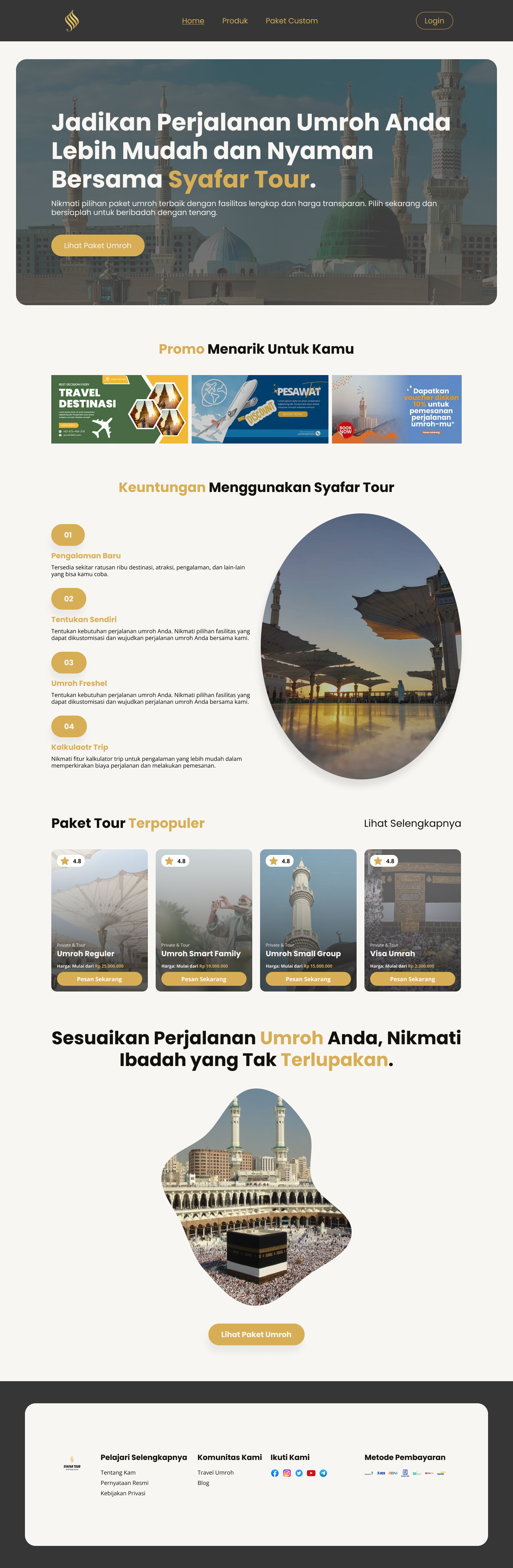 This landing page is designed to sell various Umrah packages, including regular, private, and customizable options. The site targets three main user groups: prospective pilgrims/customers, travel agents, and the central admin team.