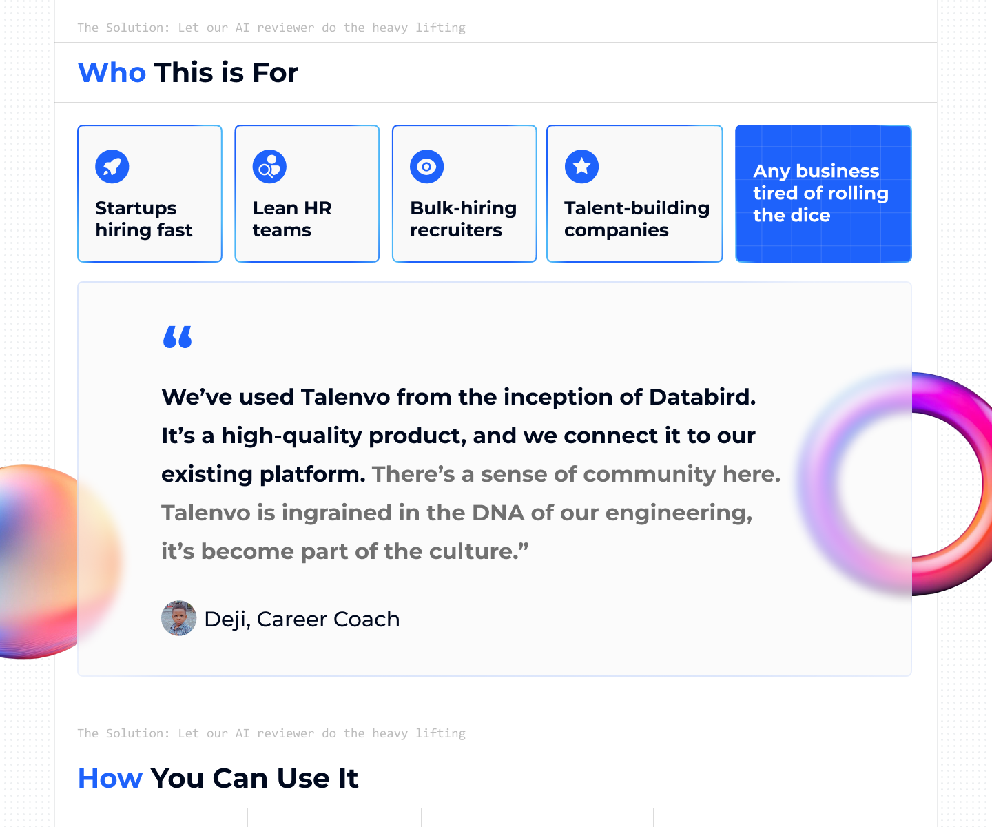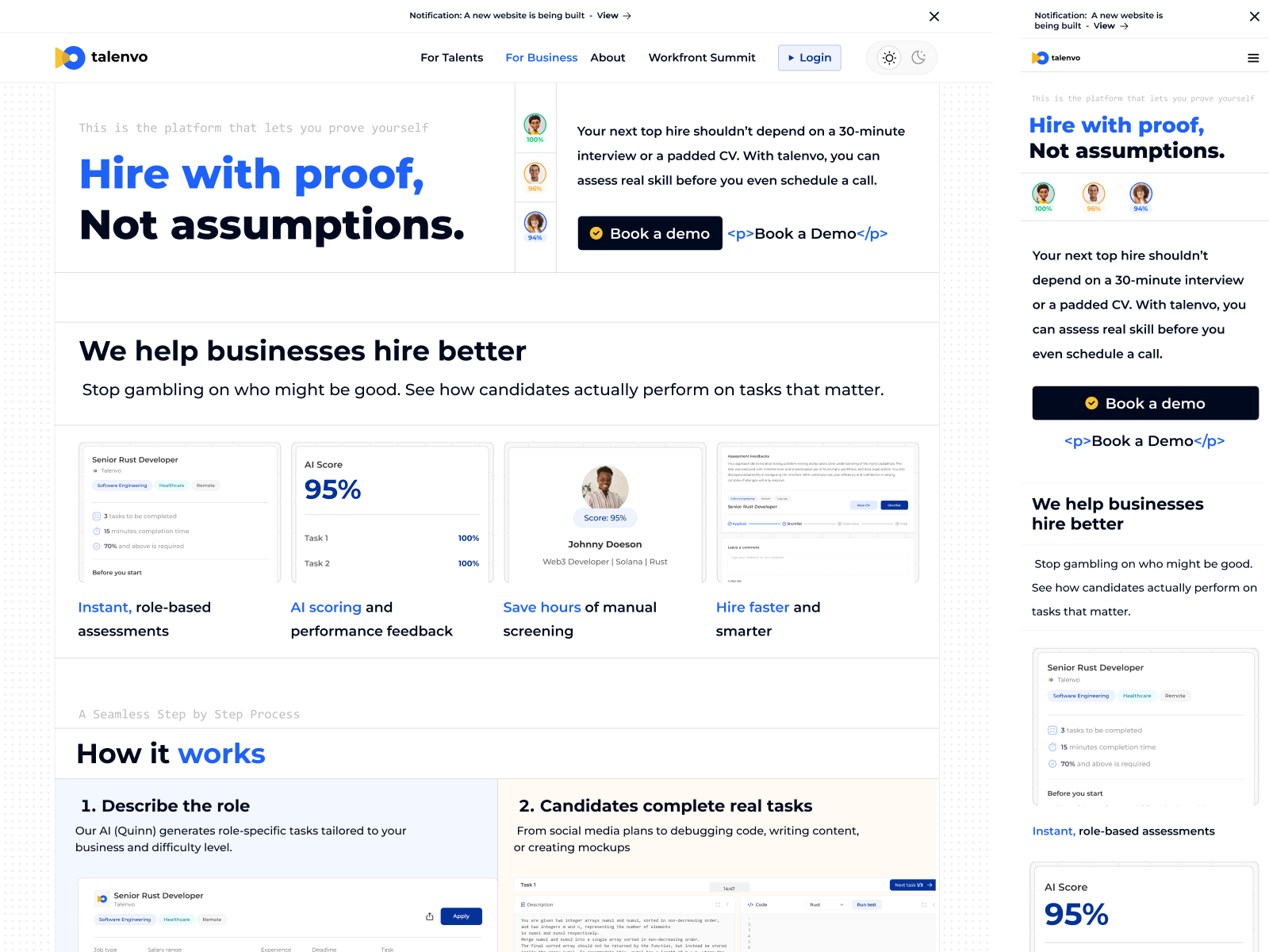 - Why: User attention spans are short. I decided against abstract visuals and chose a direct headline and clear imagery that explained exactly what Talenvo does.