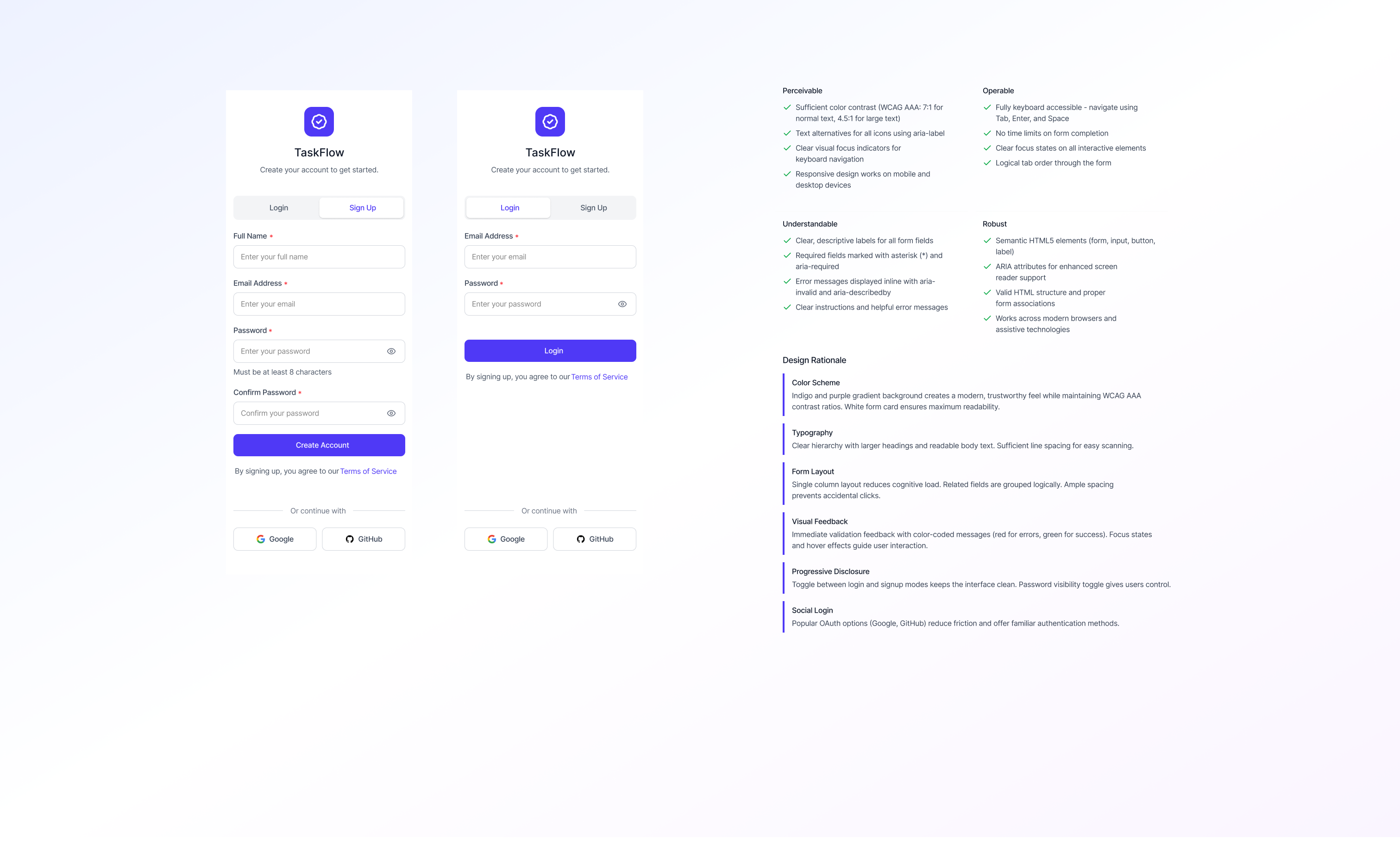 Indigo and purple gradient background creates a modern, trustworthy feel while maintaining WCAG AAA contrast ratios. White form card ensures maximum readability.