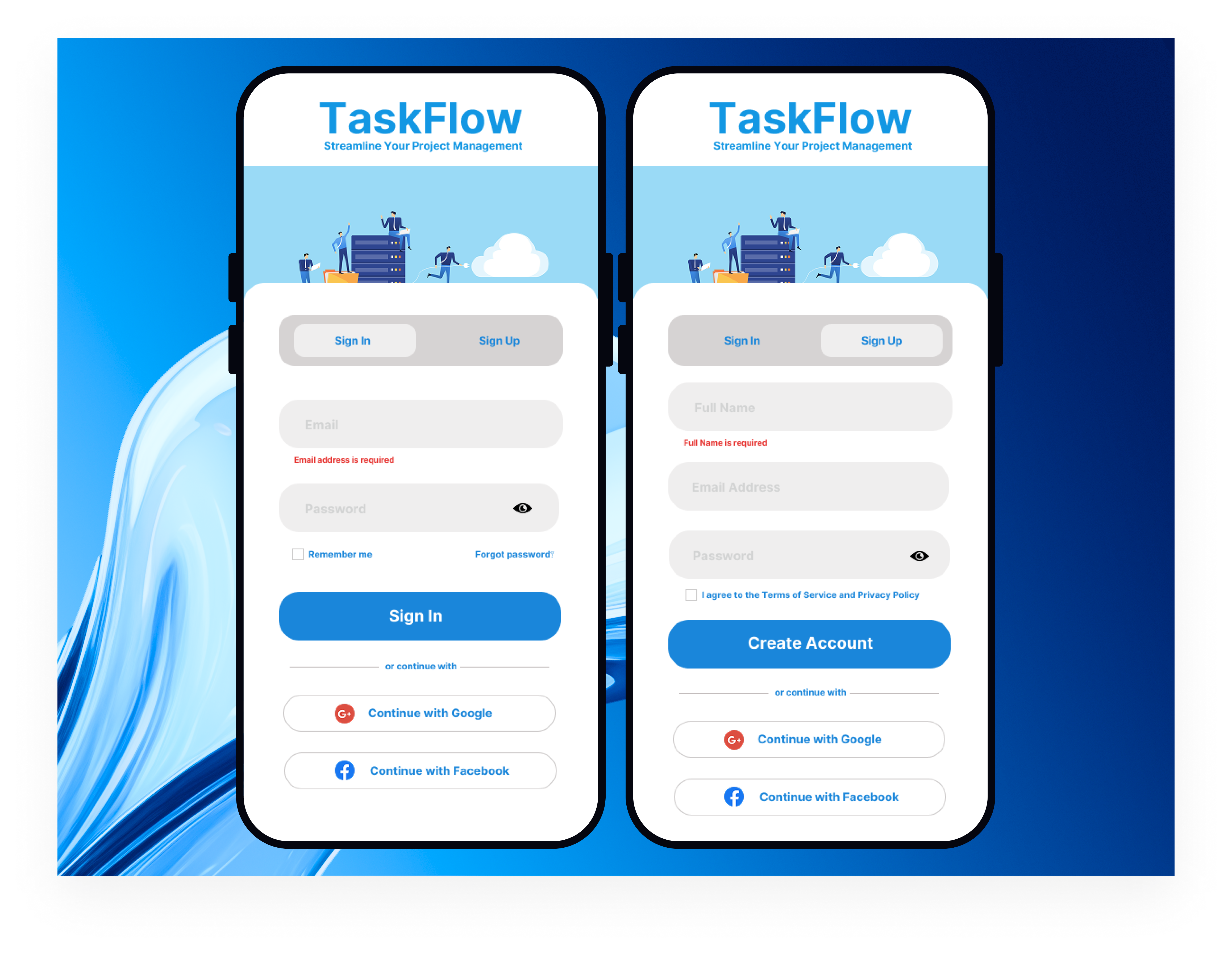 The TaskFlow mobile authentication design prioritizes professional trust-building through its gradient blue background and isometric business illustration, which directly communicates the platform's project management capabilities while maintaining enterprise-level sophistication. The dual-screen mockup demonstrates thoughtful responsive design with generous white space, clear typography hierarchy, and strategic placement of social login options (Google/Facebook) to reduce friction and leverage existing user trust for higher conversion rates.