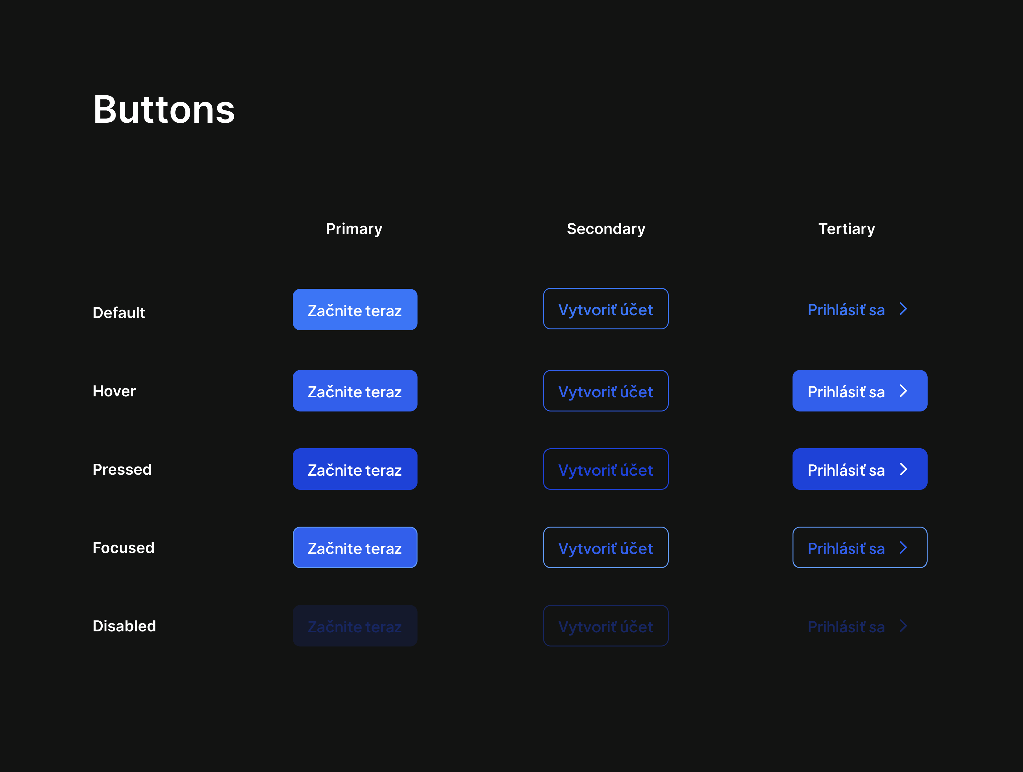 Primary Buttons -Used for key actions, visually highlighted with the signature Royal Blue color.