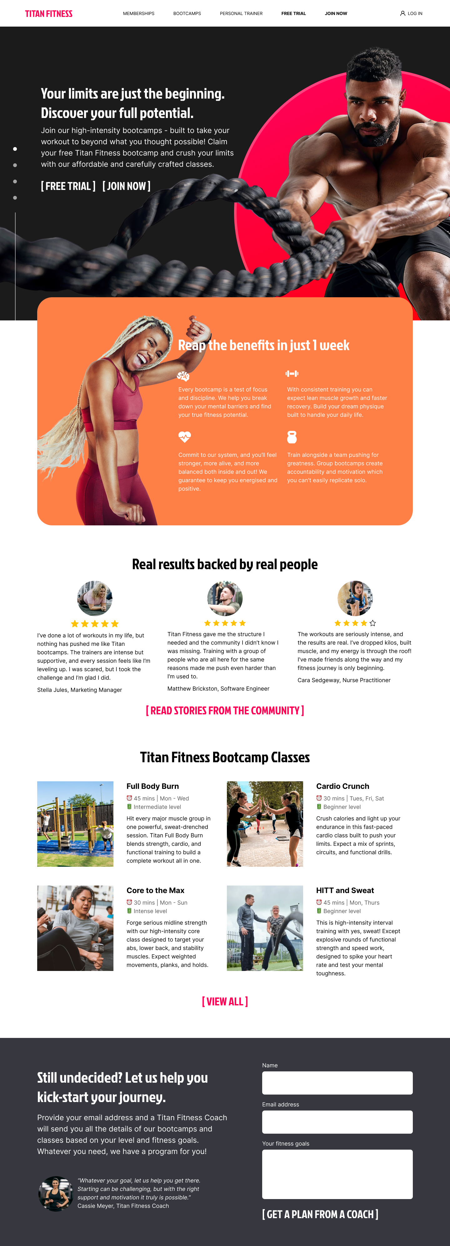 Welcome to my single landing page project! The main goal is to write compelling microcopy using the principles shared in the lessons to motivate visitors to take action and join the Titan Fitness bootcamps. Let me share how I believe I achieved this 💪
