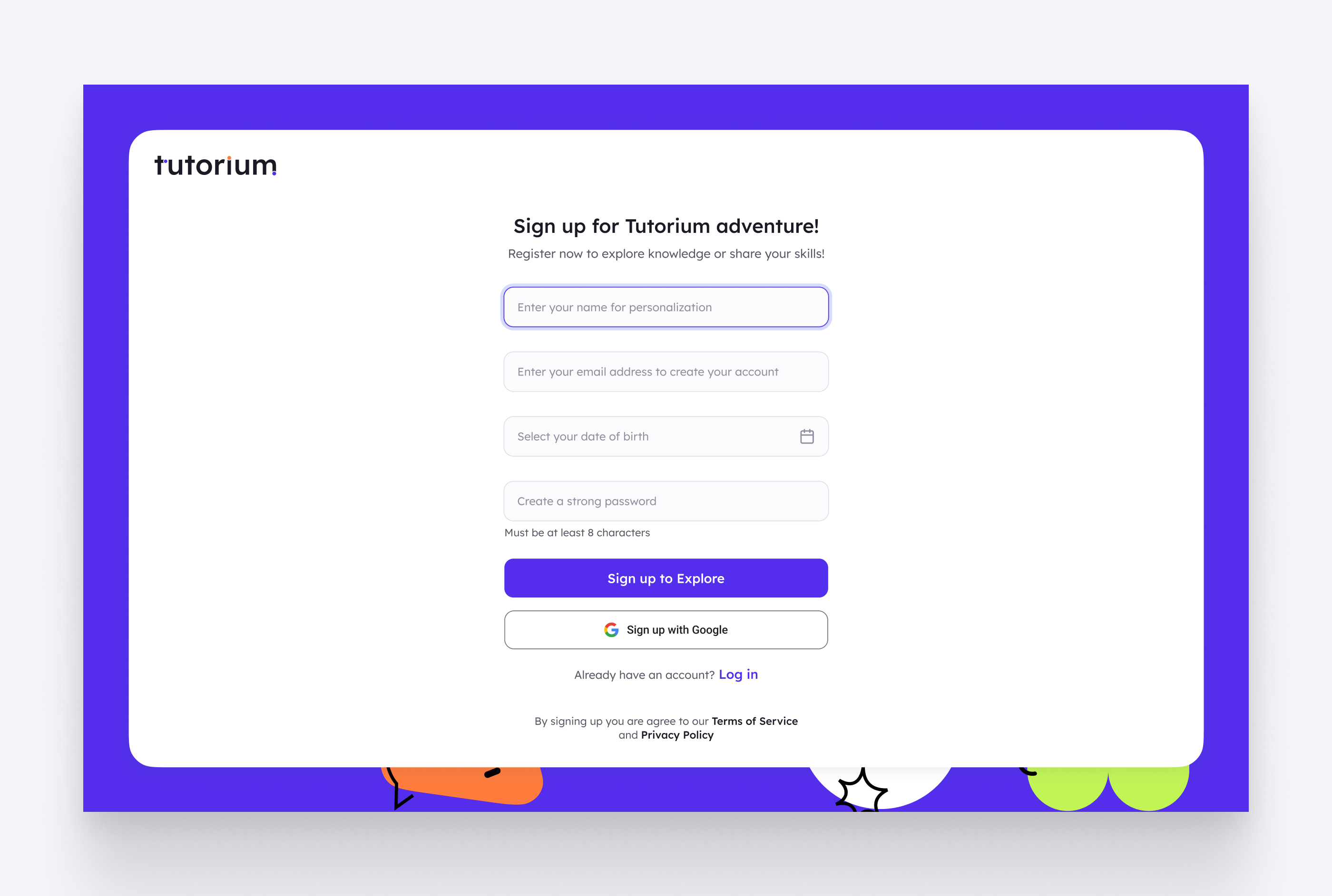 The sign-up process begins by collecting basic details like name, email, and age. Age is required to ensure that only users 18+ can create courses as tutors. After that, users choose whether they want to be a Tutor or a Tutee, guiding their experience on the platform