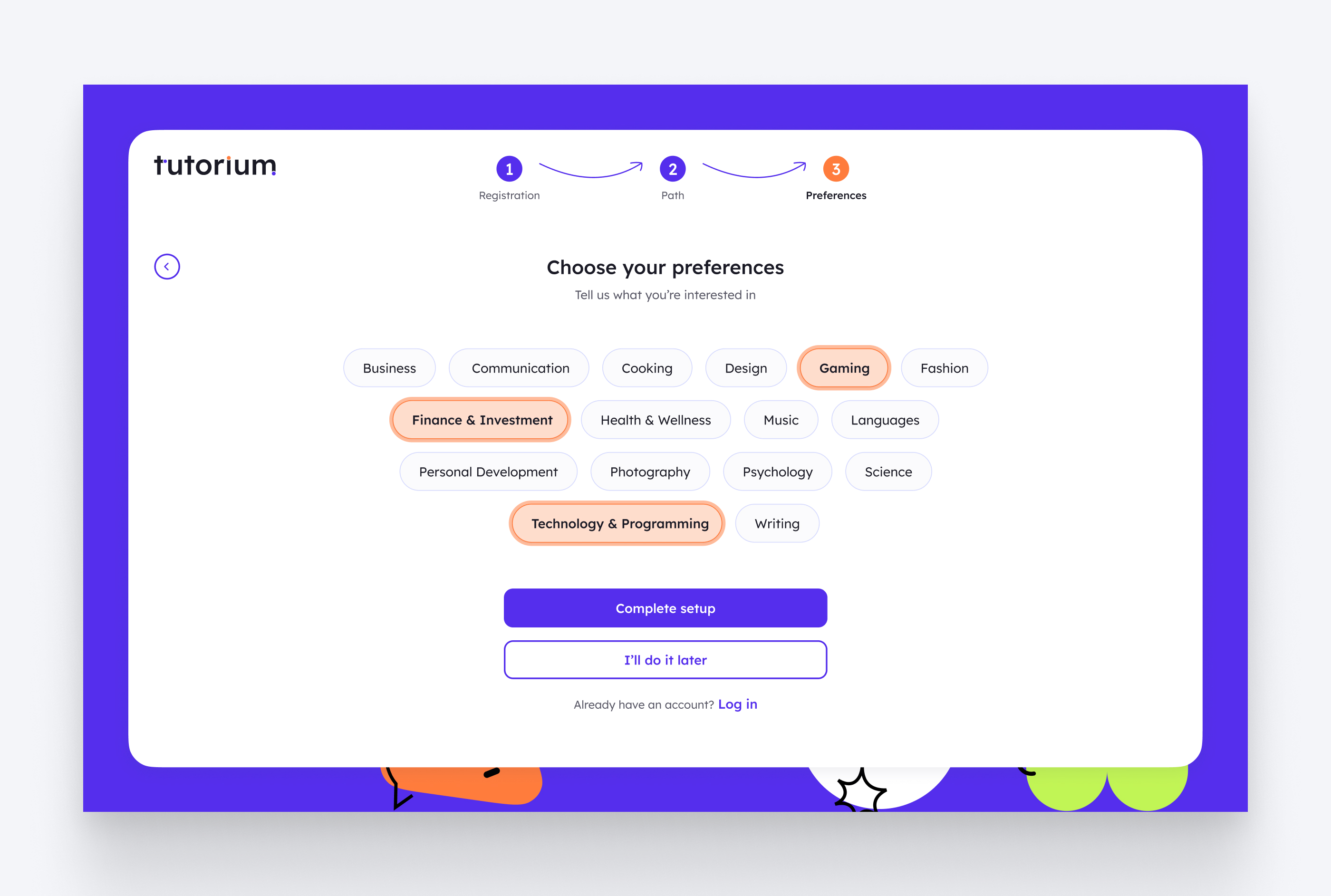 After selecting a role, the flow changes based on the choice. Tutees are directed to the Preferences screen to personalize recommended content