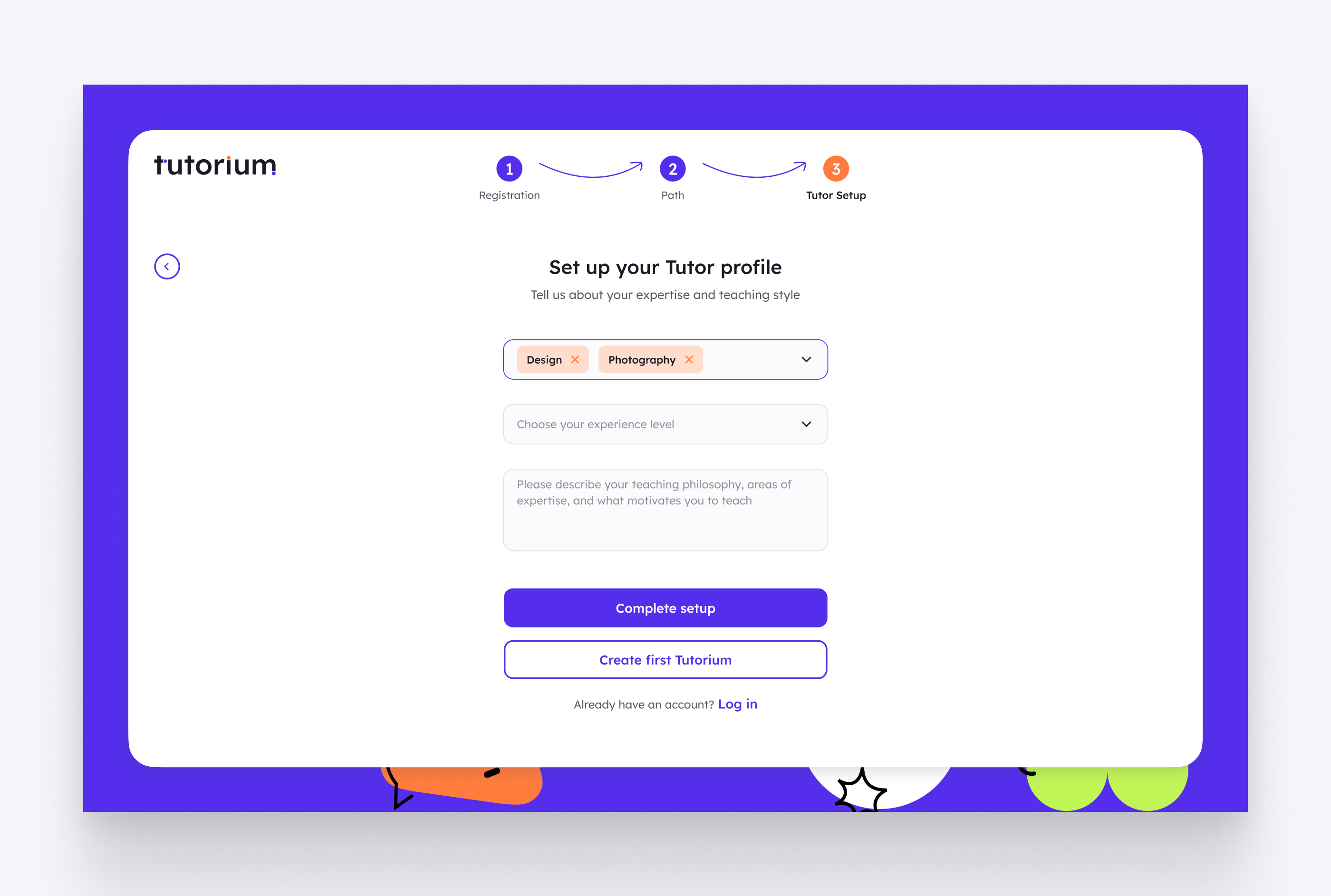 Tutors move to the profile setup screen, where they can complete profile information and start creating a course