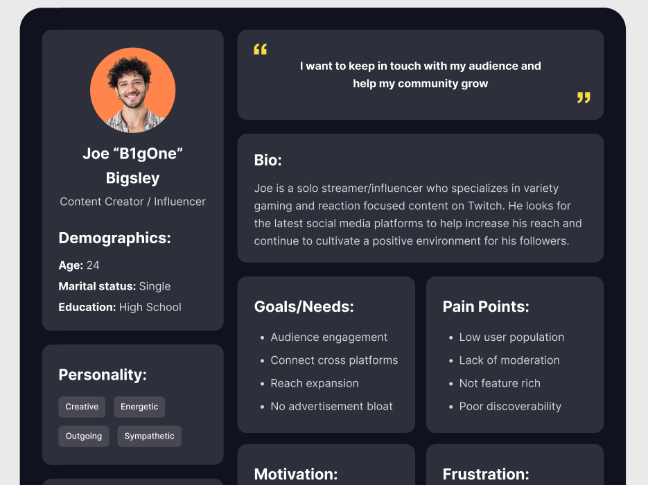 Bluesky is a up-and-coming alternative to X/Twitter. This user persona reflects a content creator/influencer, who are usually high impact users for social media. Research was gathered through feedback posts about the app and general personality traits of individuals who would fall into the content creator category.