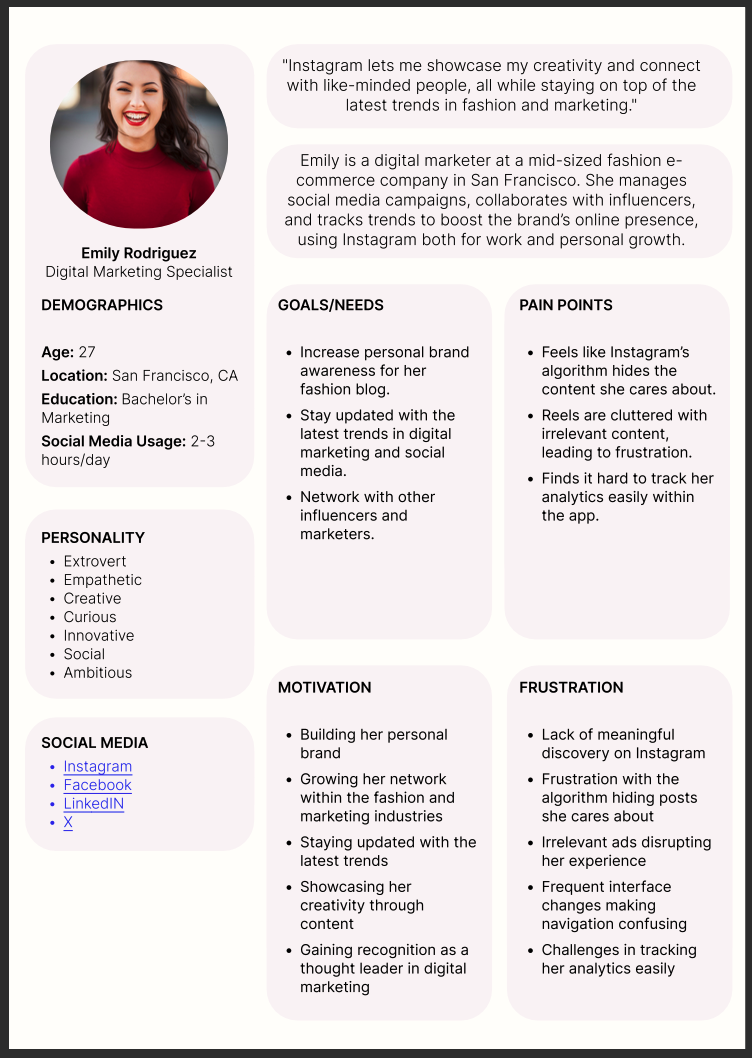 The persona provides a good foundation but could benefit from more granular details and scenarios to fully inform the design process. Adding specific user journeys, real data, and emotional insights would enhance its usability for design teams aiming to create more personalized and impactful experiences on Instagram.