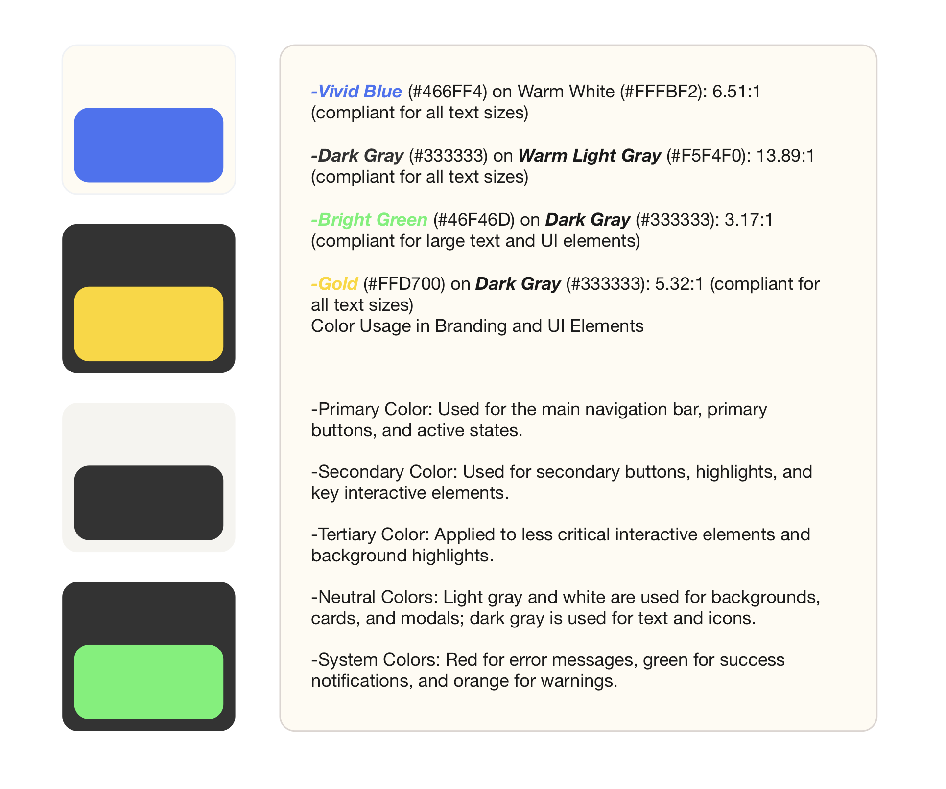 -Bright Green (#46F46D) on Dark Gray (#333333): 3.17:1 (compliant for large text and UI elements)