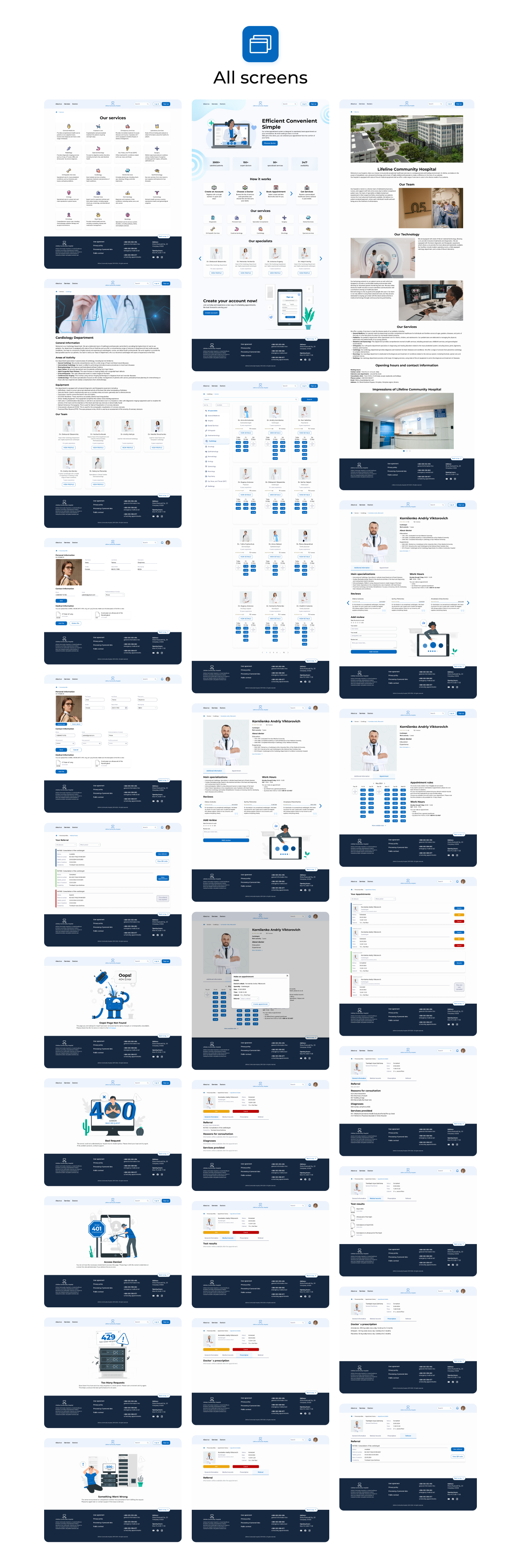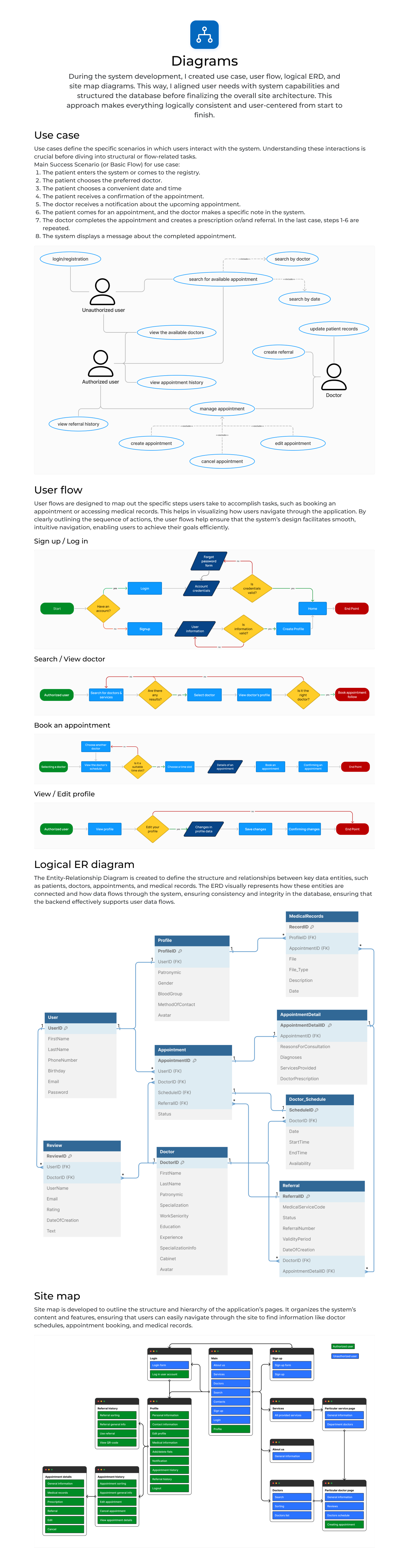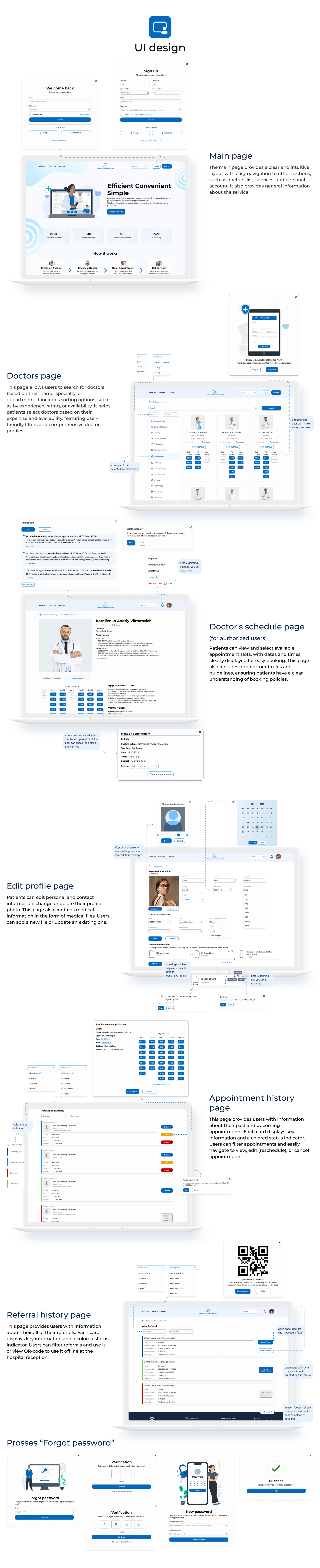 This is an app for medical services, and these are the two variants of light and dark mode. Below, I am describing some of the decisions. I