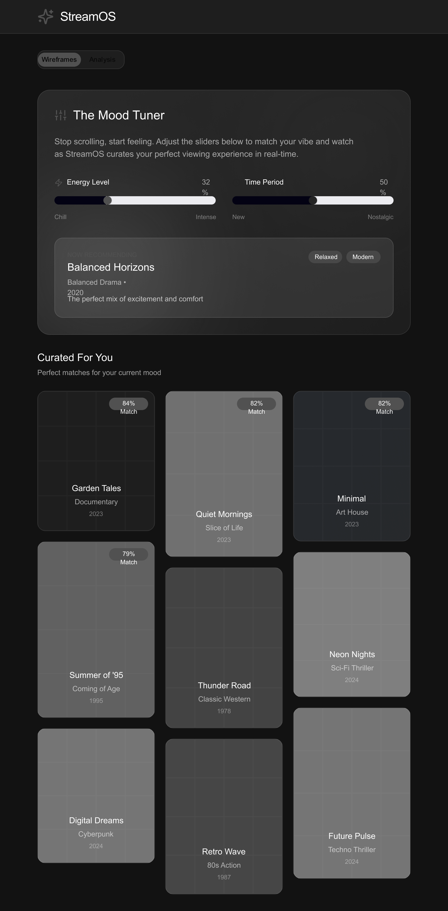 Project Overview: StreamOS is a concept for a next-generation tablet and desktop video streaming application designed to solve "decision fatigue." Unlike competitors that rely on endless static grids, StreamOS utilizes an AI-driven Mood Tuner, allowing users to discover content based on emotional intent (e.g., "Chill vs. Intense") rather than just genres.
